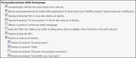 2. Cambiamo impaginazione: Le tre colonne possono essere ridotte a due mettendo la spunta a "Sposta la lista dei filtri in cima alla colonna di destra", successivamente possiamo sfoltire il contenuto della colonna destra togliendo da essa frivolezze come le sezioni "Connettiti con i tuoi amici", "Poke", "In primo piano" e "Persone che potresti conoscere". Ecco come appare la Home Page dopo alcune modifiche.